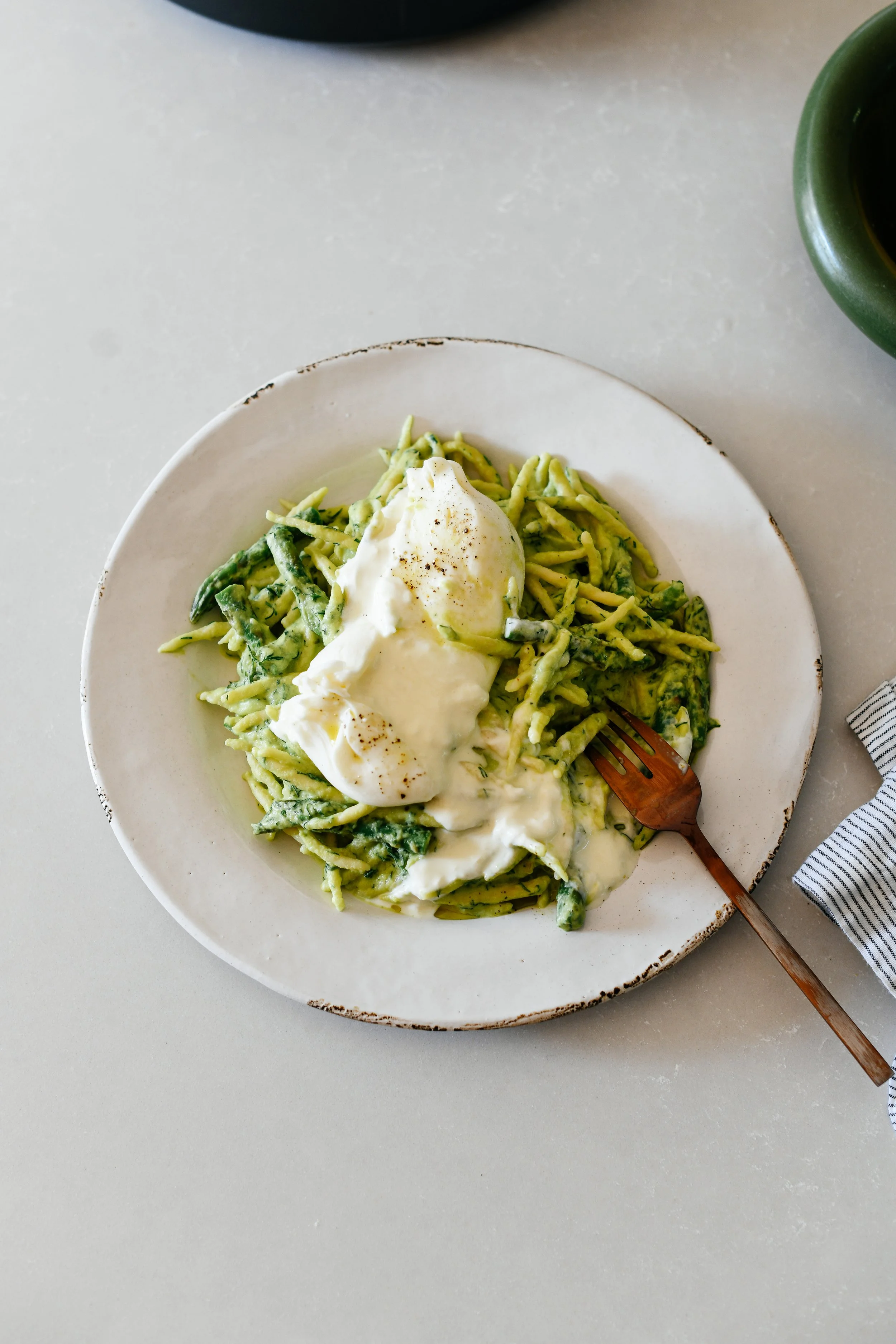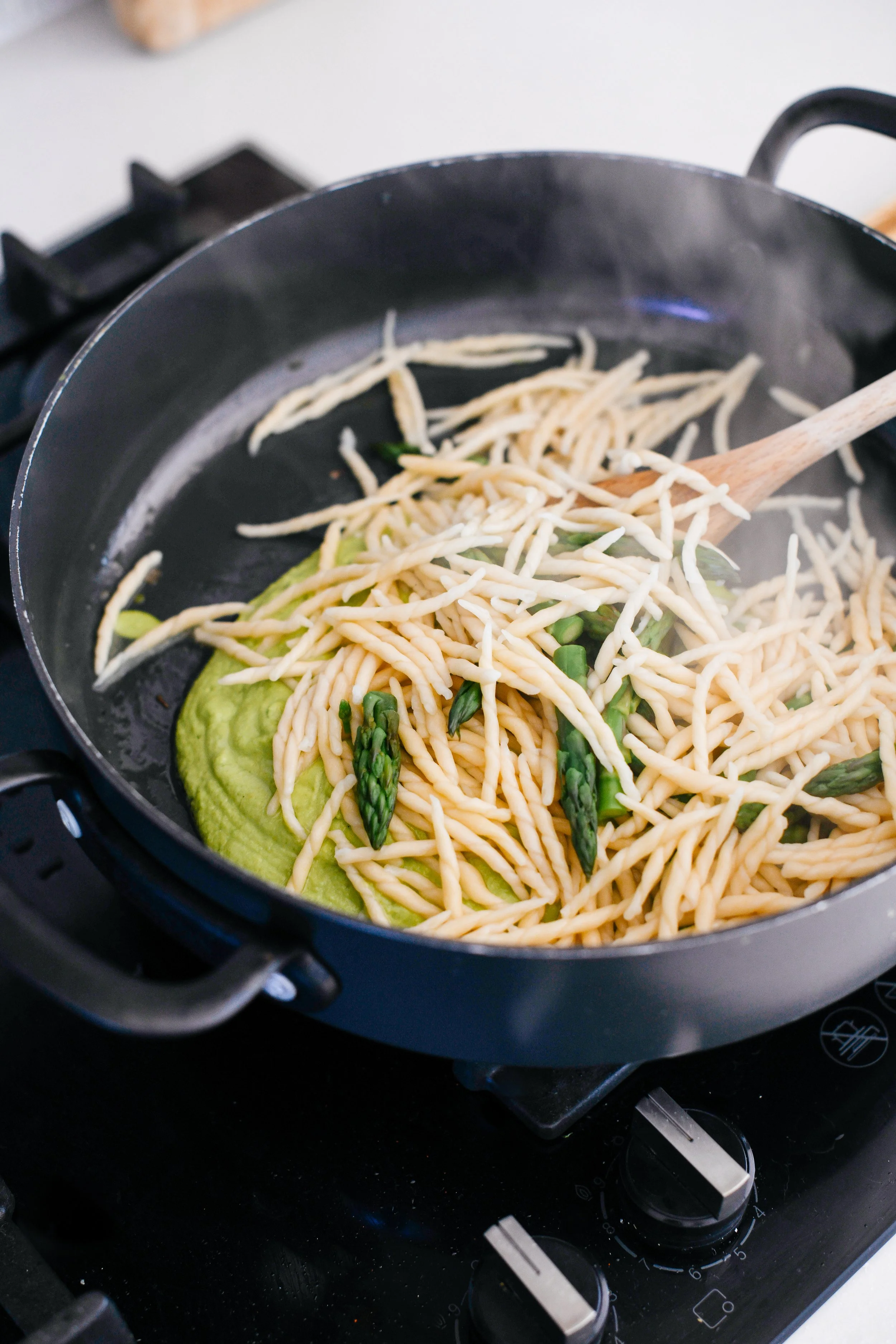 Using a spider or slotted spoon, transfer the trofie and spears directly to the sauce keeping warm. Add 1/4-1/2 cup of the pasta water to help loosen the sauce and marry everything together.