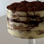 Repeat until you reach the top of your dish (I ended up with 5 layers of biscuits) – finishing with a layer of cream and a generous dusting of cocoa powder.