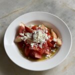 A wonderful sweet and savoury salad, perfect for enjoying tomatoes and nectarine when they’re in their absolute prime. Paired with a classic vinaigrette and adorned with sharp and crumbly feta cheese, this is the salad I’m making on repeat right now.