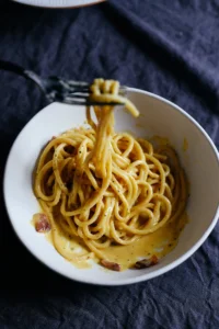 4. Back to the butter – add a 1/4 cup of the pasta water and immediately whisk and shake the pan continuously to create an emulsion. Throw in the Fiori di zucca and basil leaves.